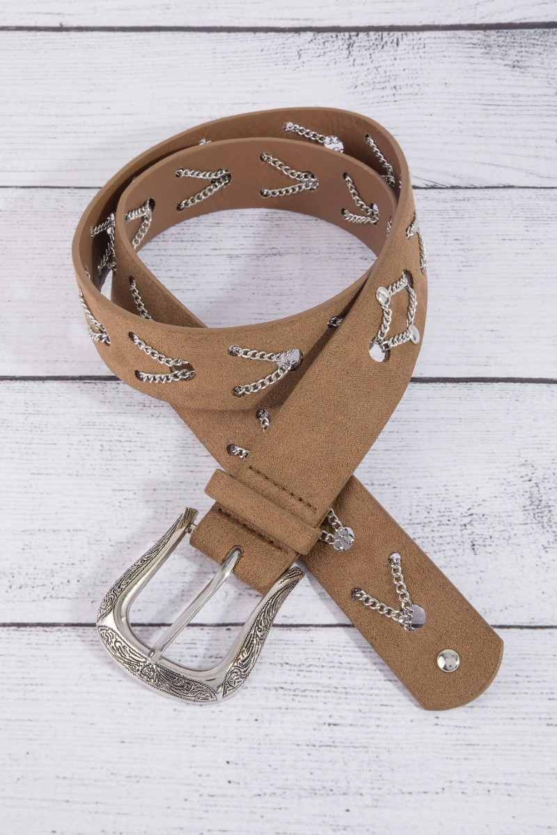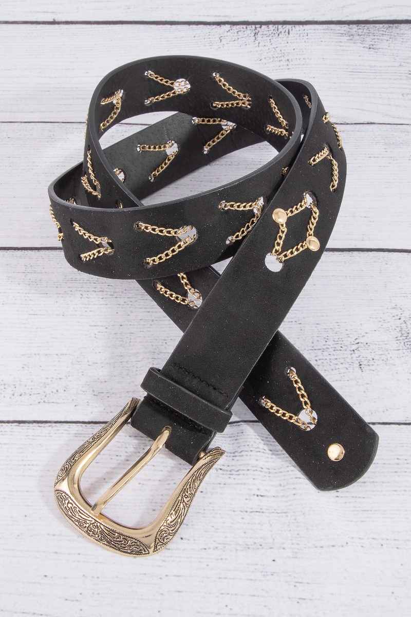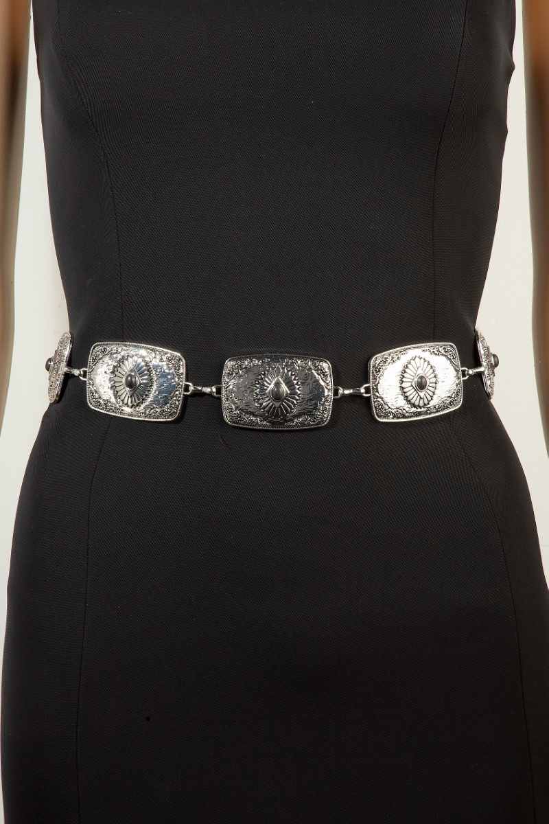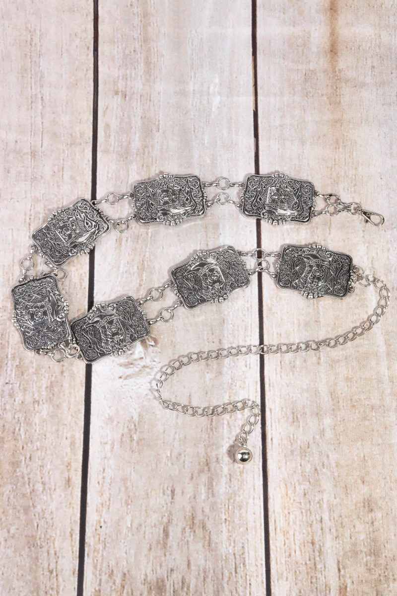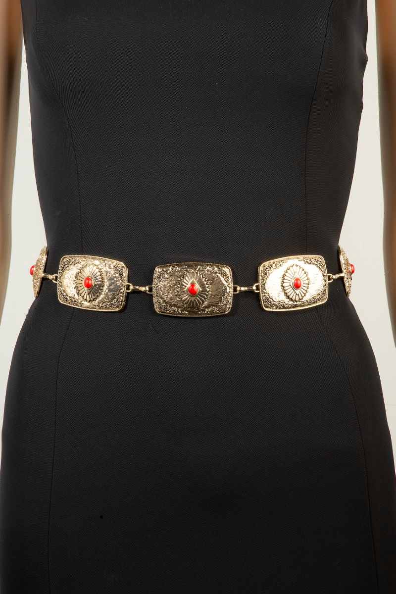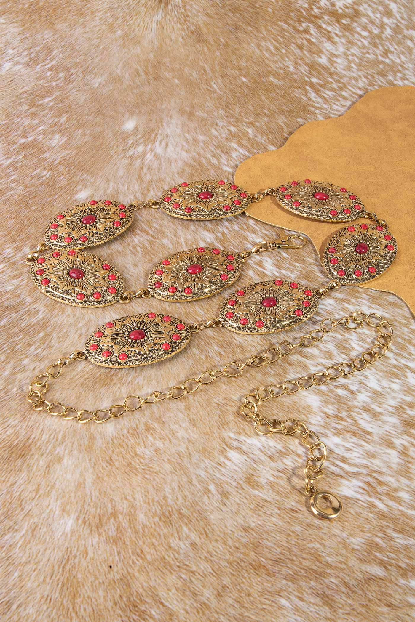 | Gold-tone alloy chain belt featuring ornate etched Western-style. | |||