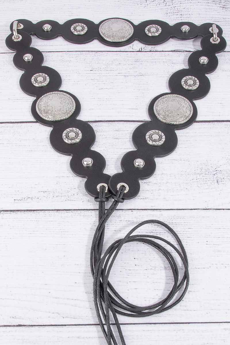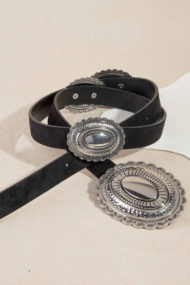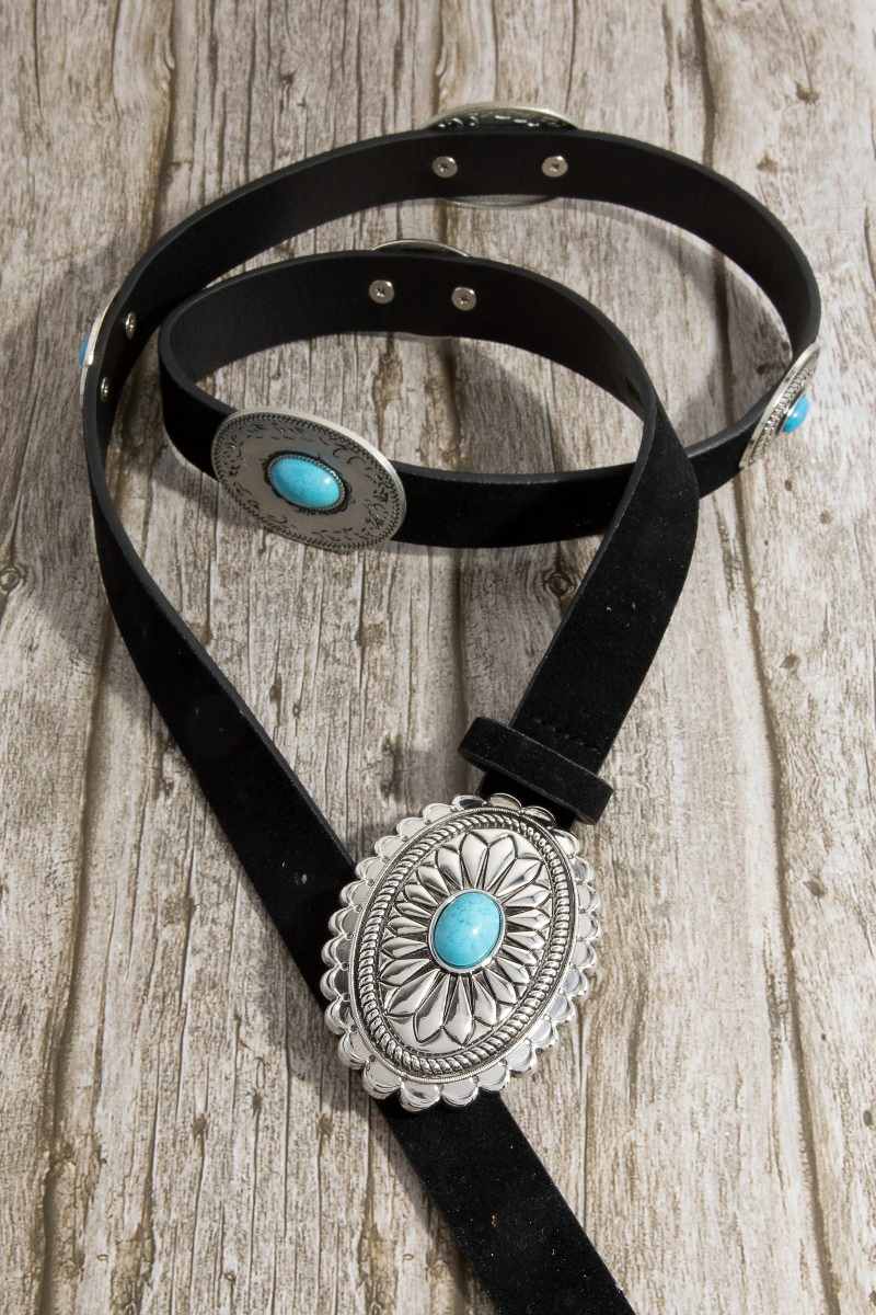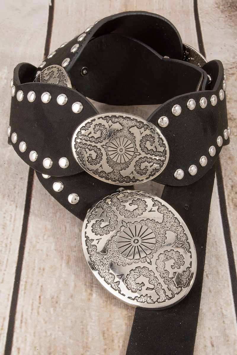 | Black faux suede Western concho belt featuring large oval silver. | |||||
