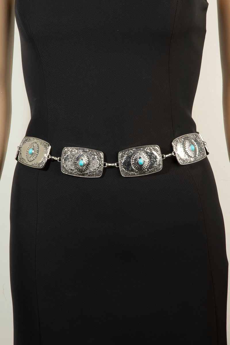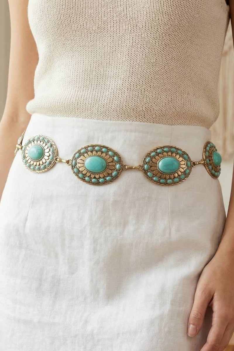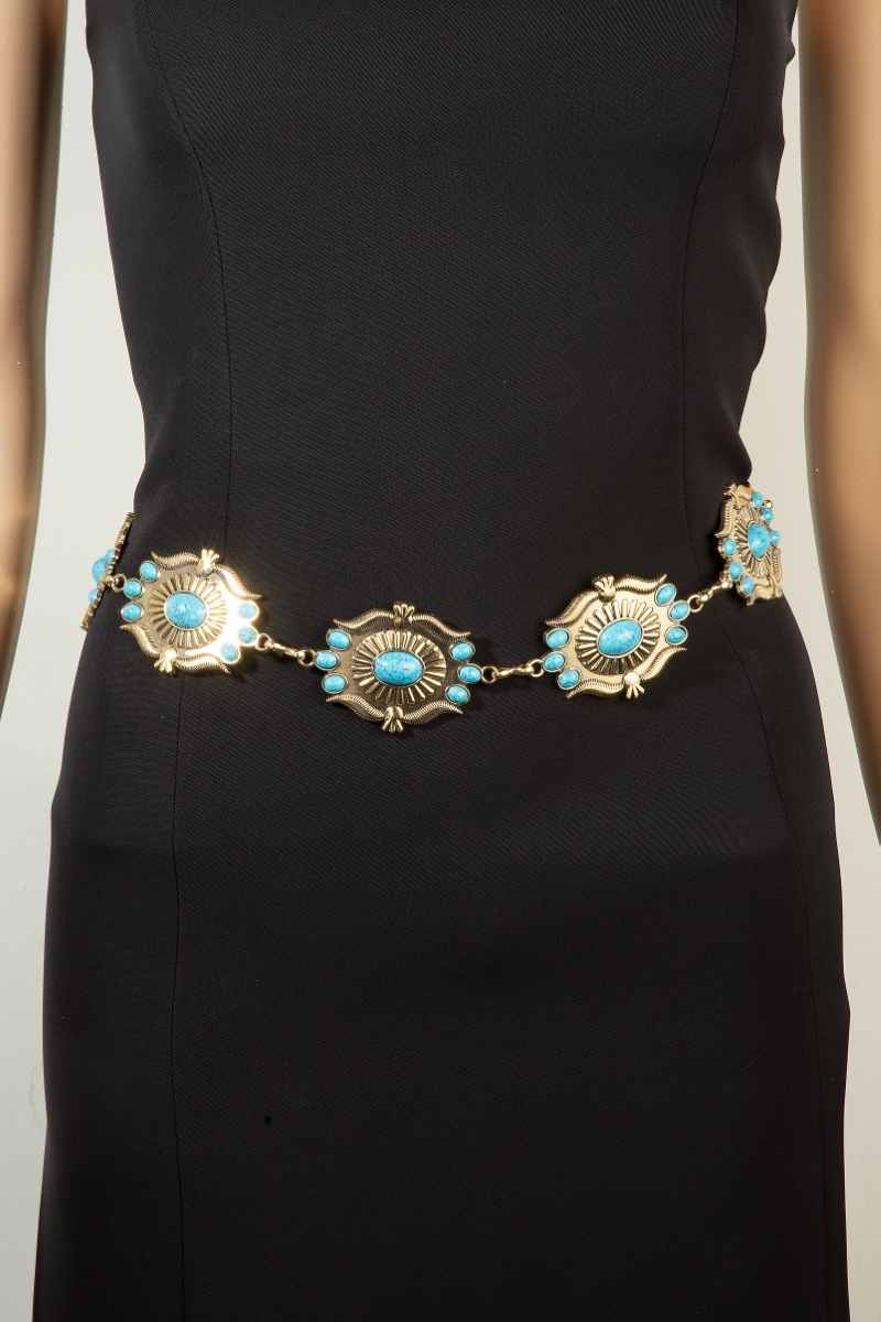 | Antique gold alloy chain belt with ornate turquoise stone concho plates. | |||