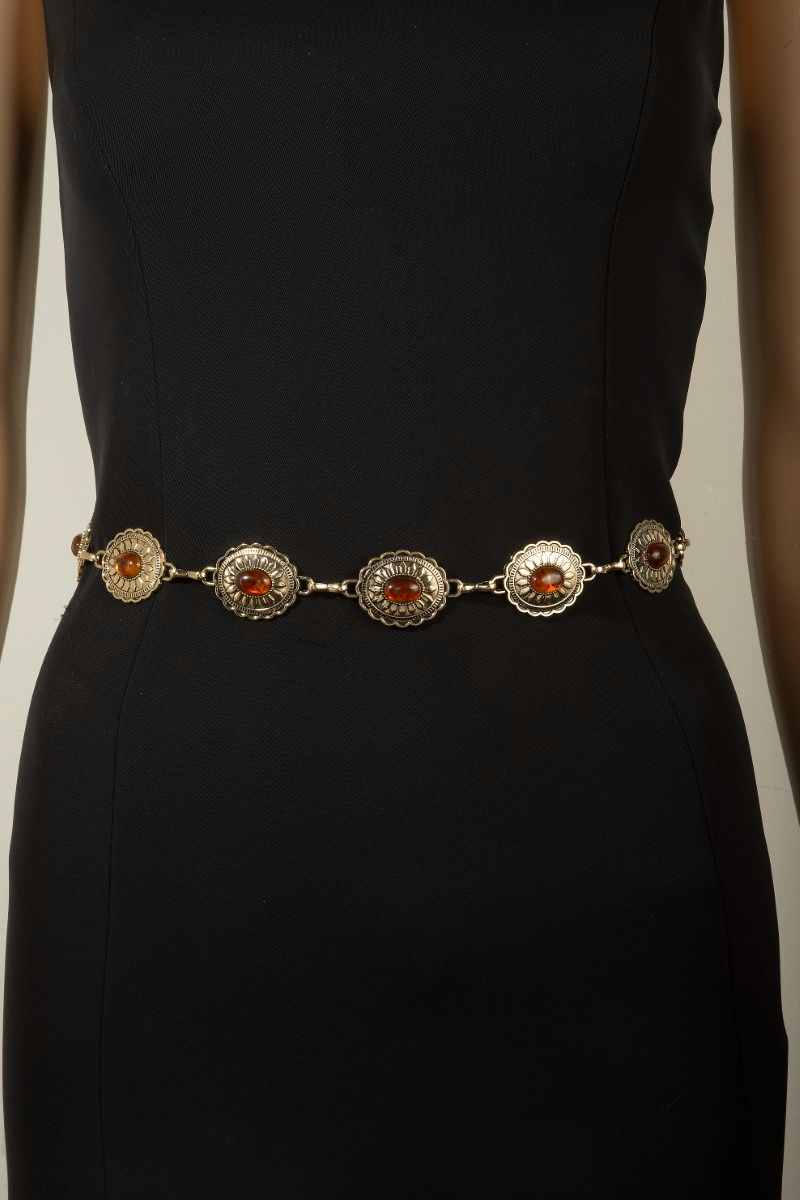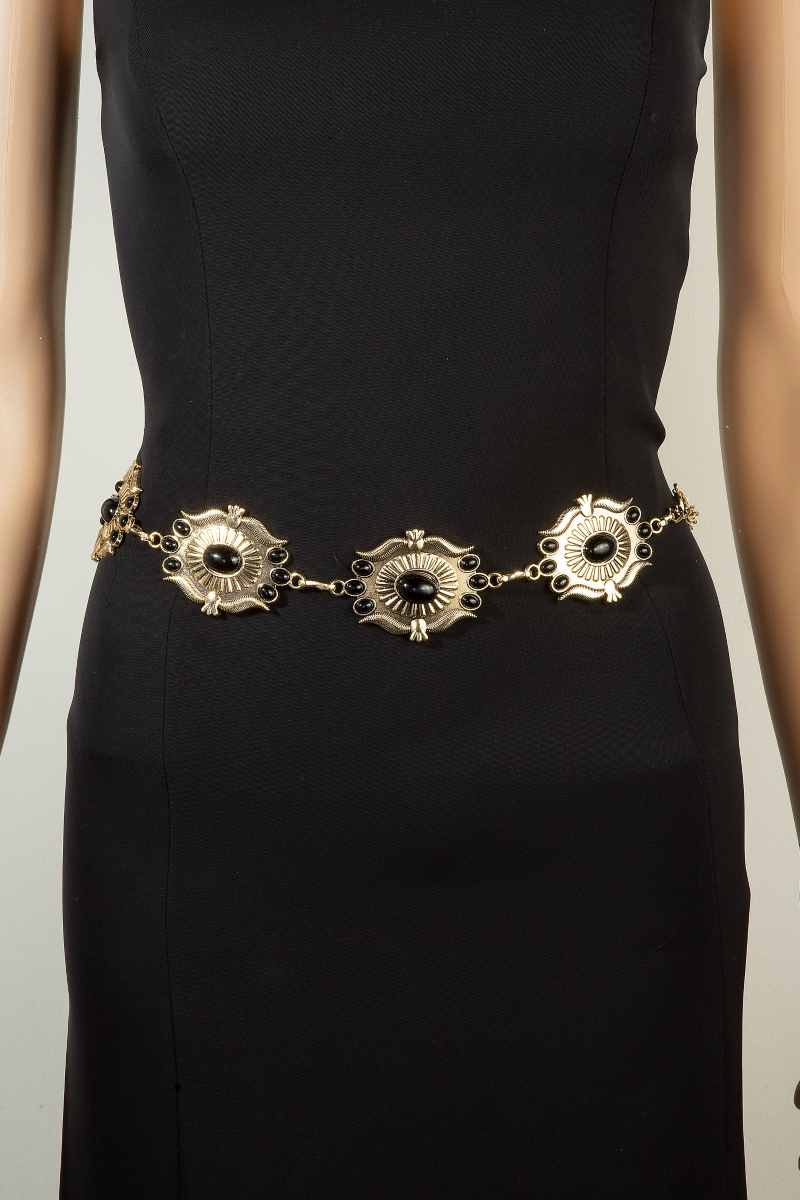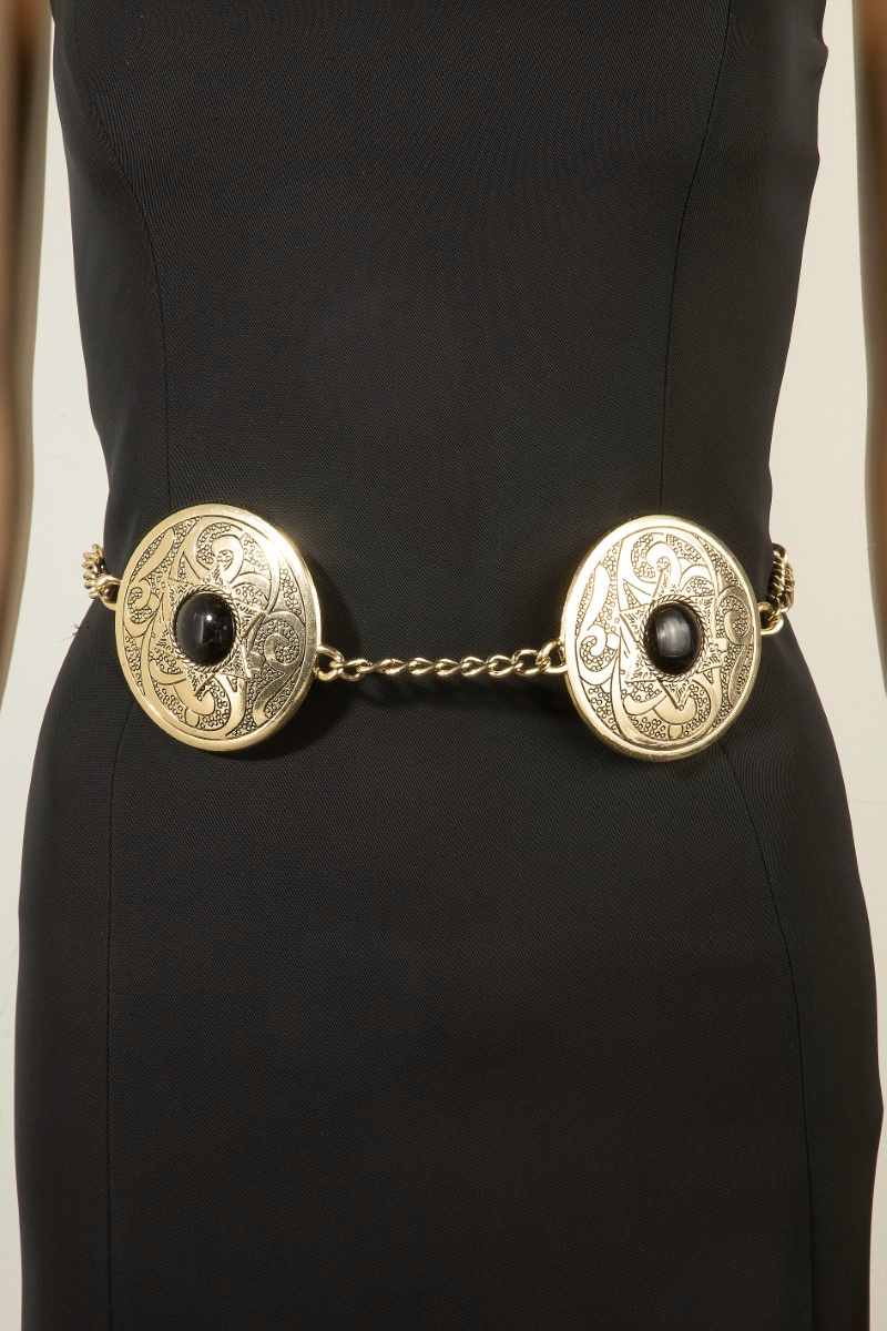 | Gold-tone alloy chain belt with ornate medallions featuring black oval. | |||