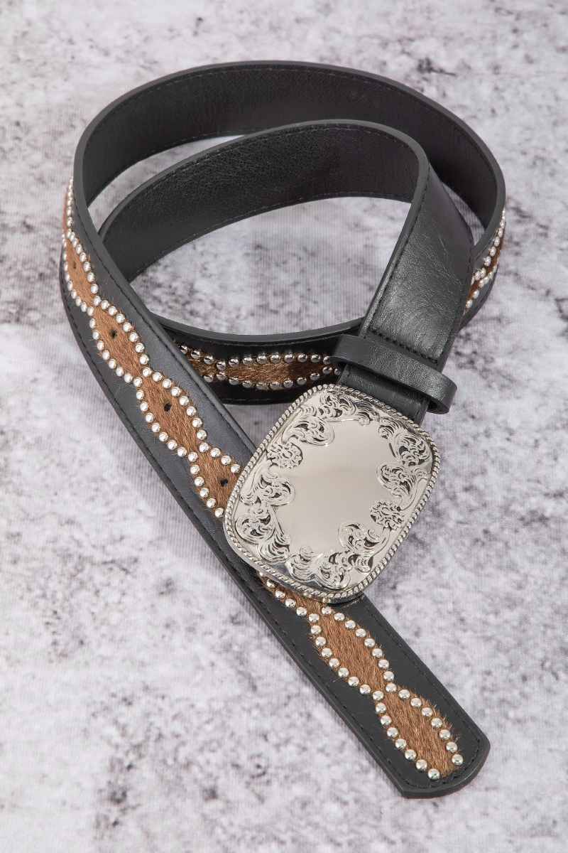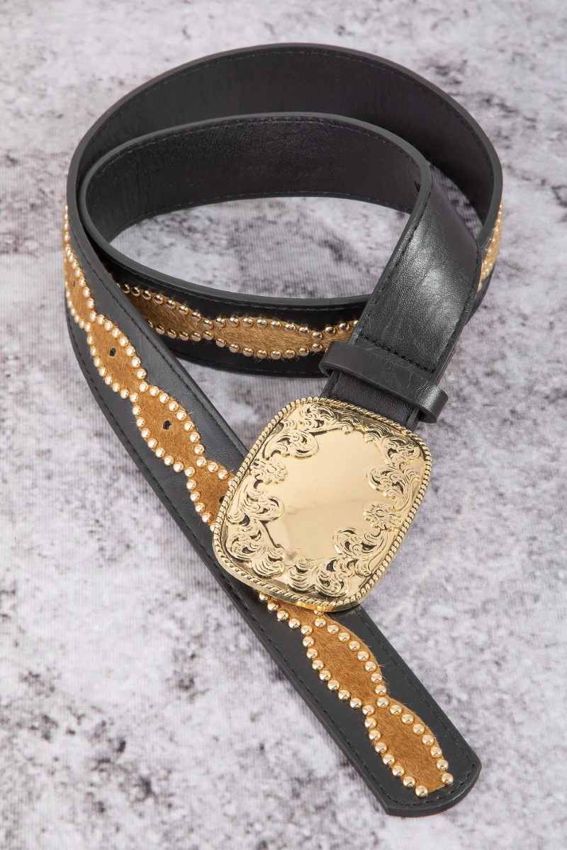 | Western black faux leather belt with tan textured inlay, gold studs. | ||||