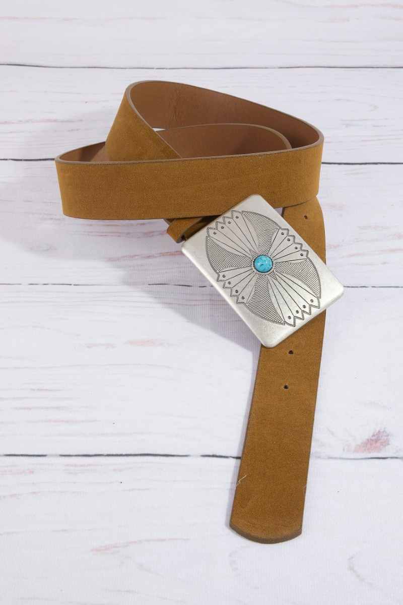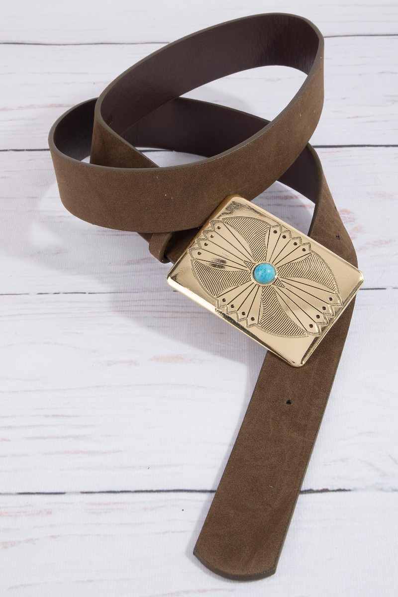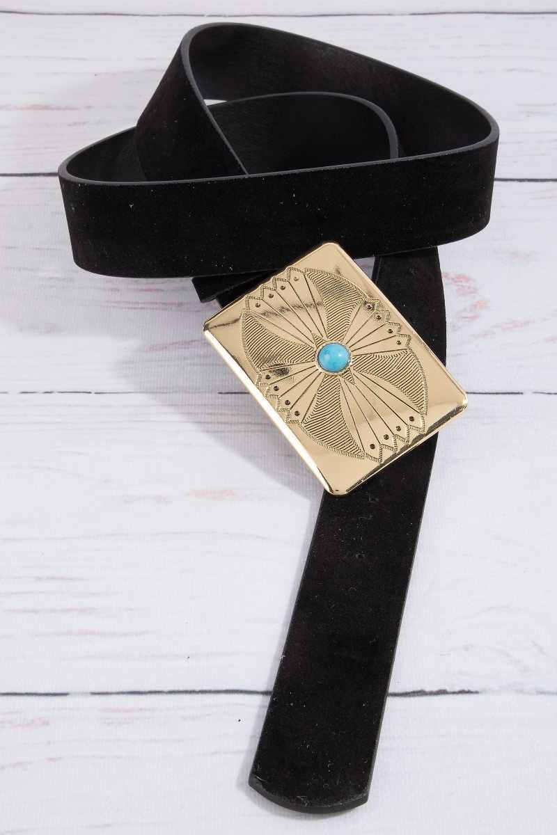 | Black faux leather belt with ornate antique gold western buckle featuring turquoise. | ||||