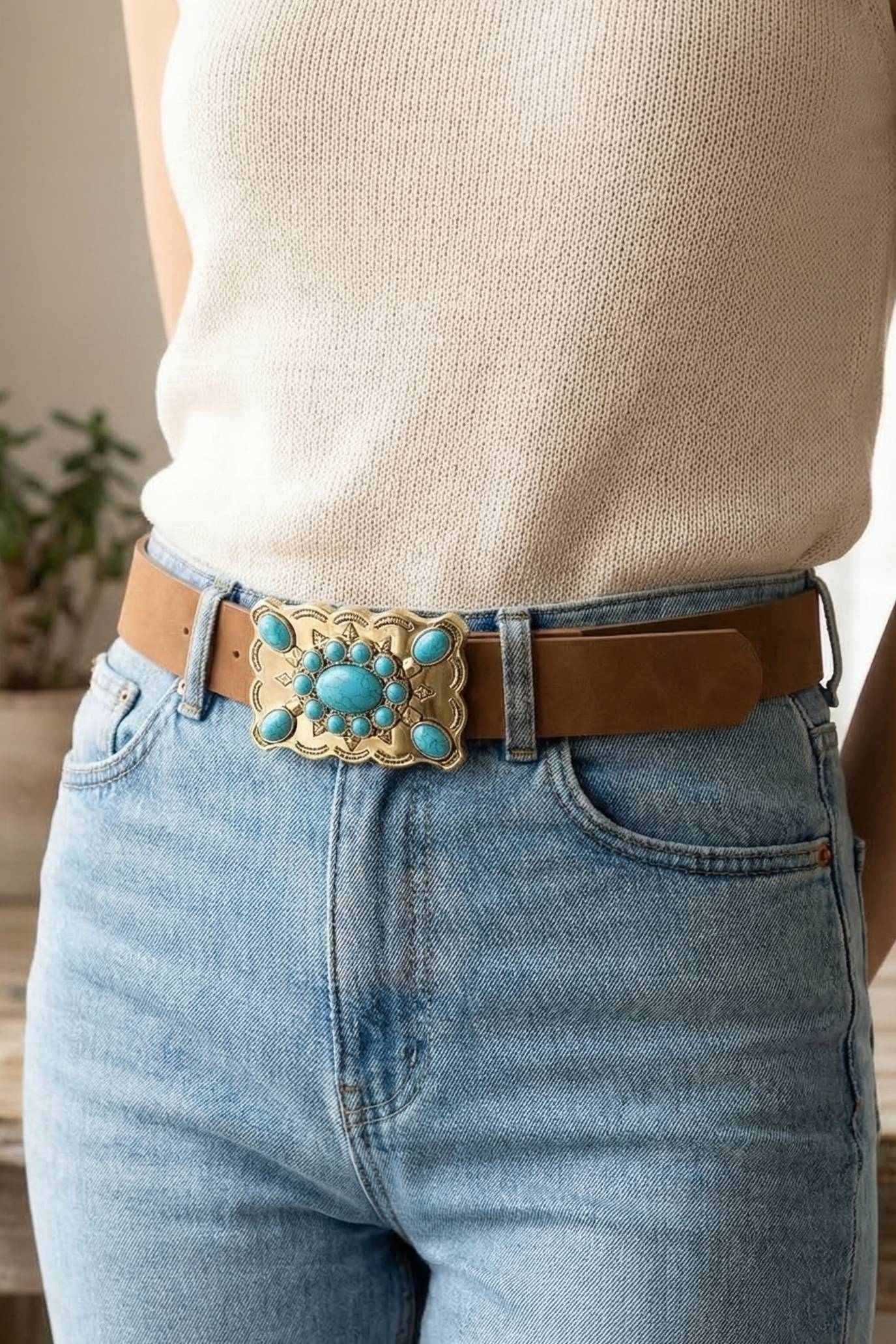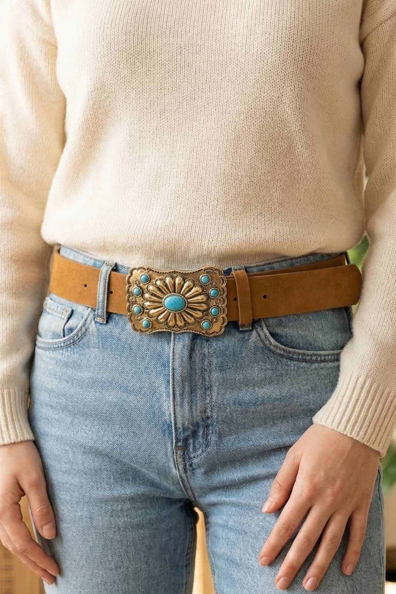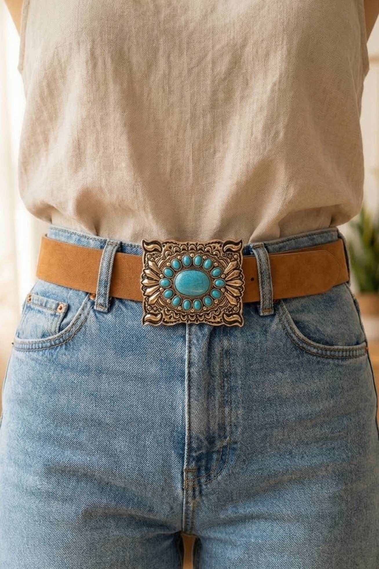 | Black faux leather belt with ornate antique gold western buckle featuring turquoise. | ||||