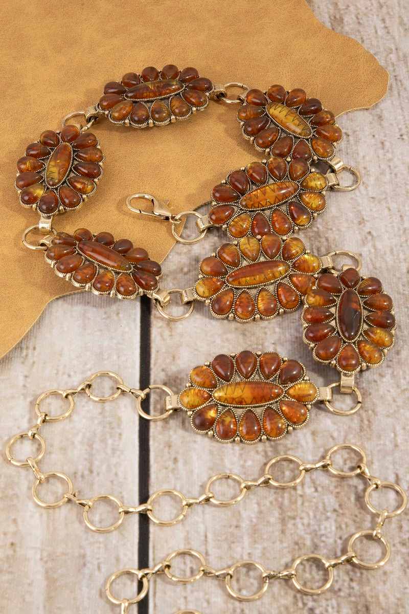 | Gold-tone alloy chain belt featuring amber-look resin. | |||