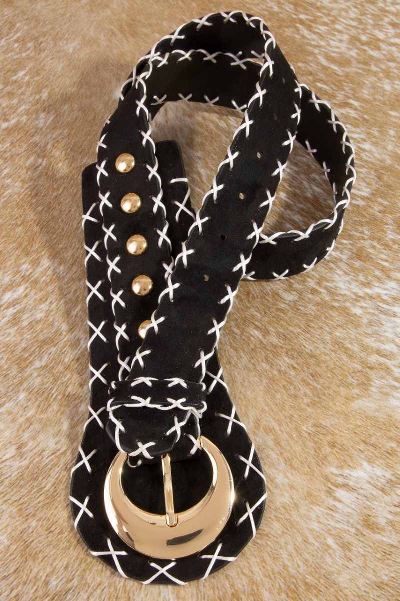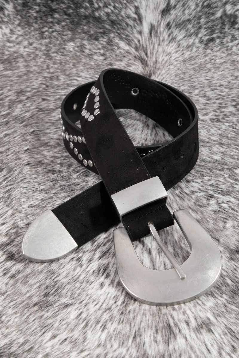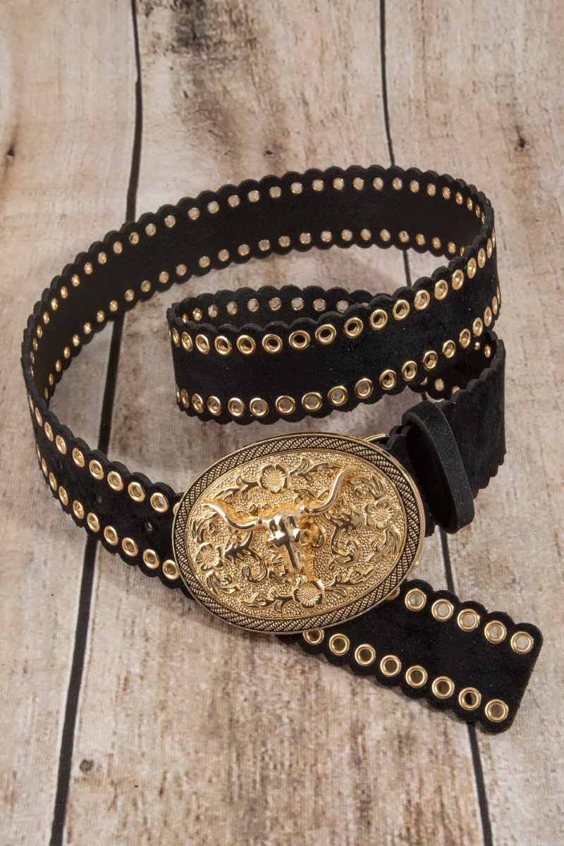 | Western black faux suede belt featuring an ornate gold-tone con. | ||||