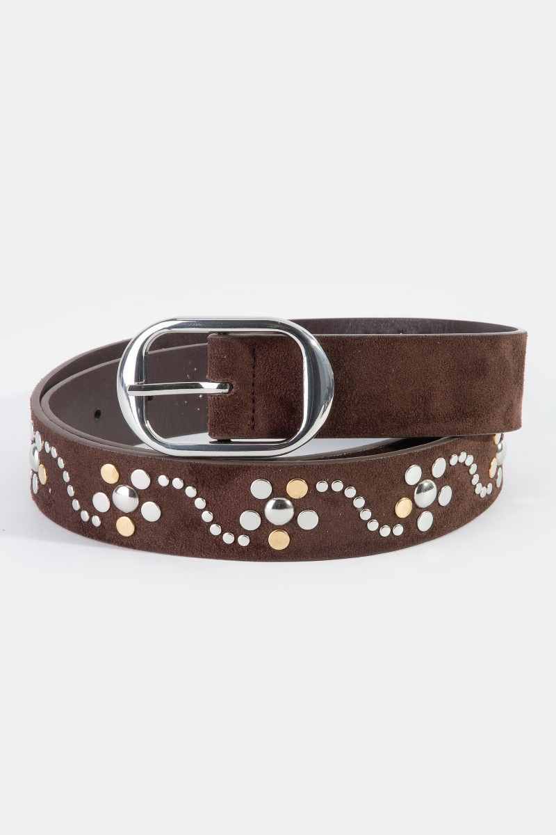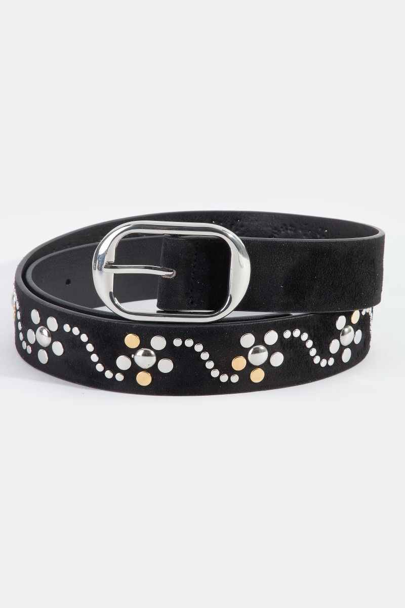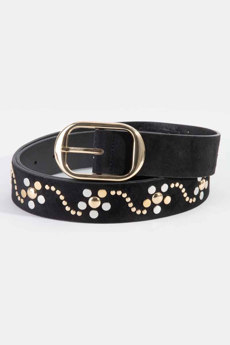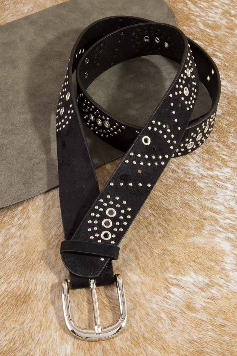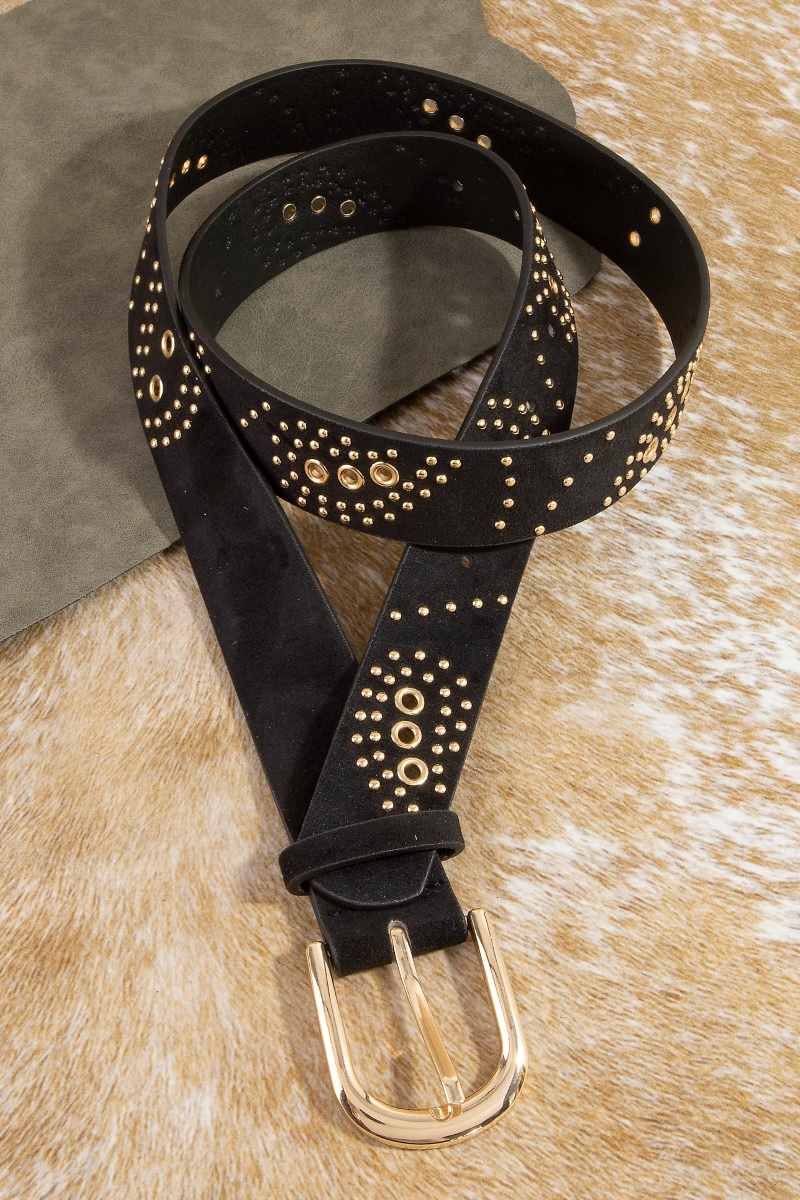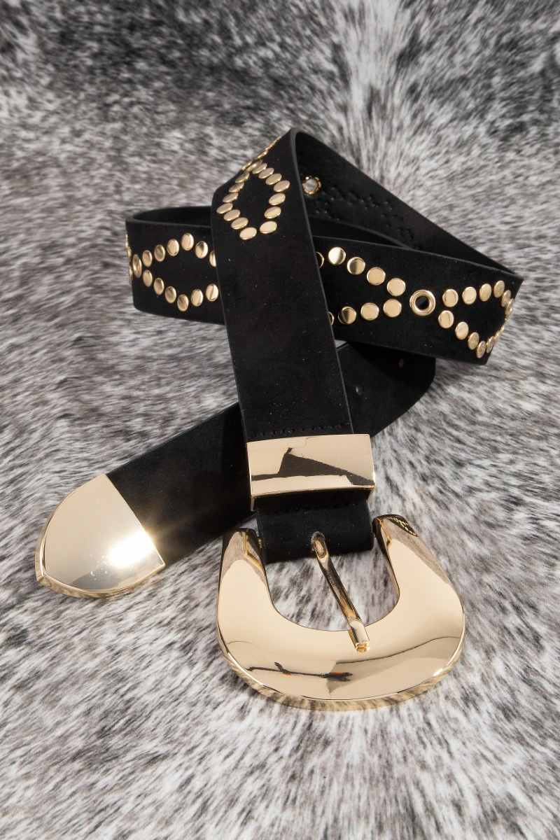 | Black faux suede belt with gold-tone studs and grommets. | |||