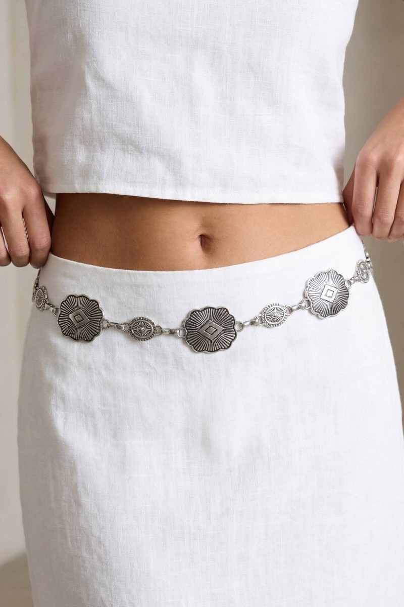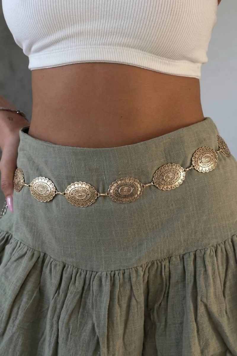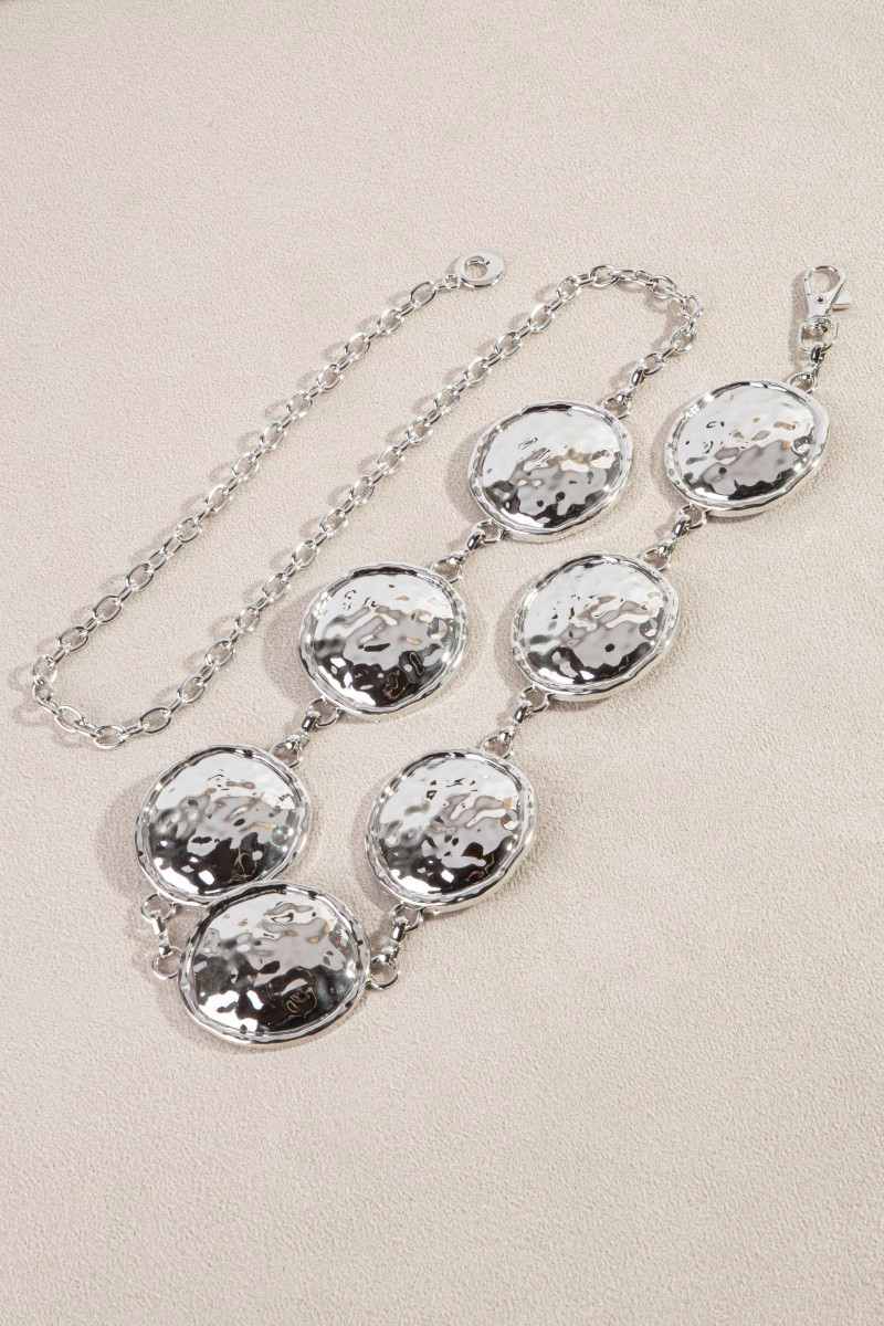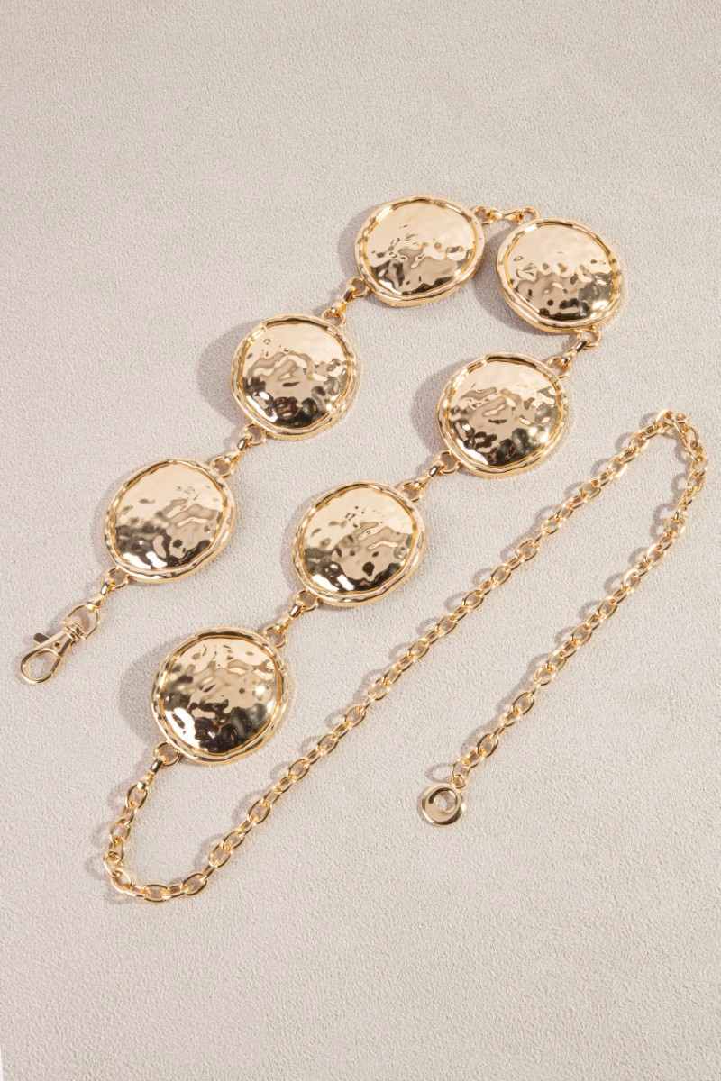 | Gold-tone alloy chain belt featuring hammered round medallions. | |||