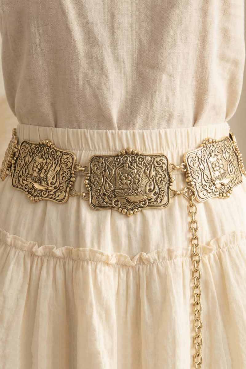 | Gold-tone alloy chain belt with ornate rectangular panels featuring. | ||||