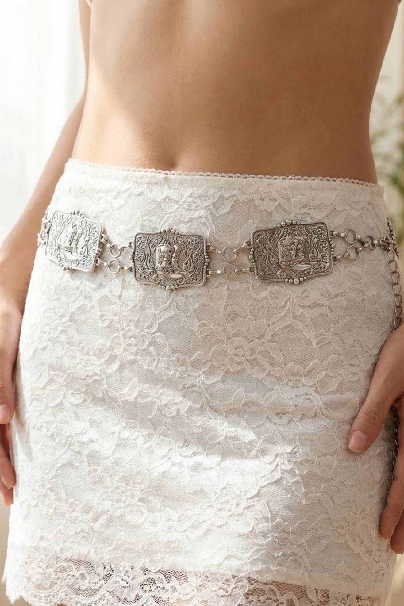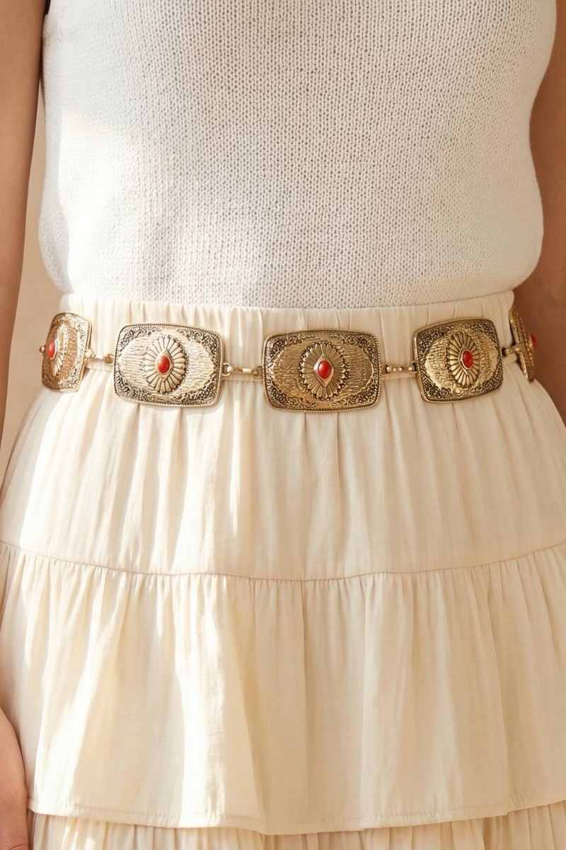 | Antique gold alloy chain belt featuring ornate rectangular Western-style. | |||