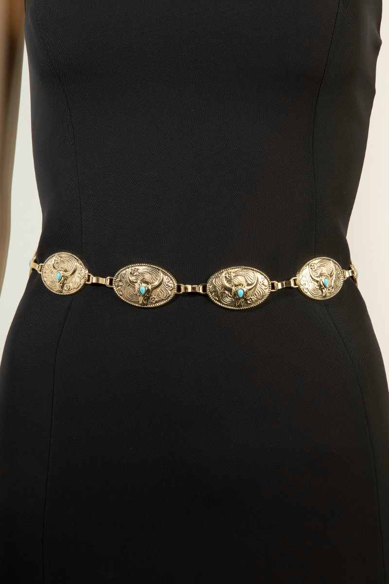 | Gold tone metal western belt with engraved bull skull conchos and turquoise accents. | ||