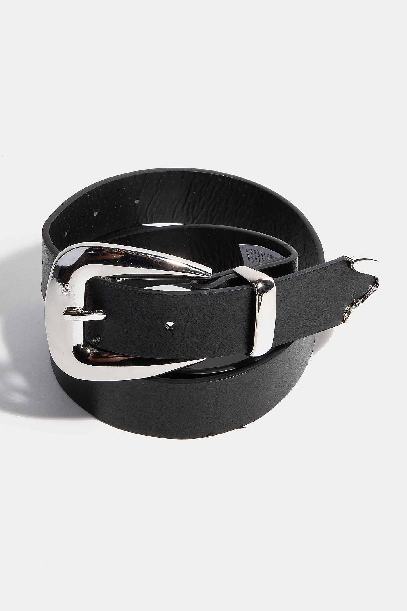 | Black bonded leather belt with silver-tone western buckle, double. | ||||